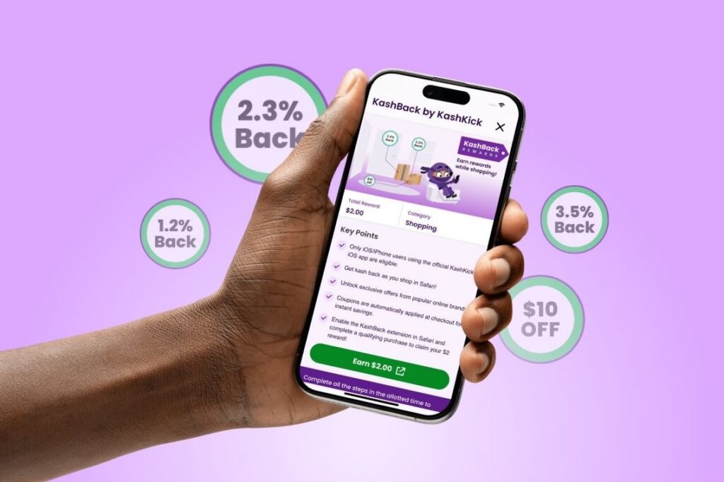 Installing a free browser extension is one of the simplest ways to start. KashKick’s KashBack extension for automatically tracks eligible purchases and can apply coupons at checkout. There’s no credit check and no minimum spend to get started—and you earn $2 just for installing it.