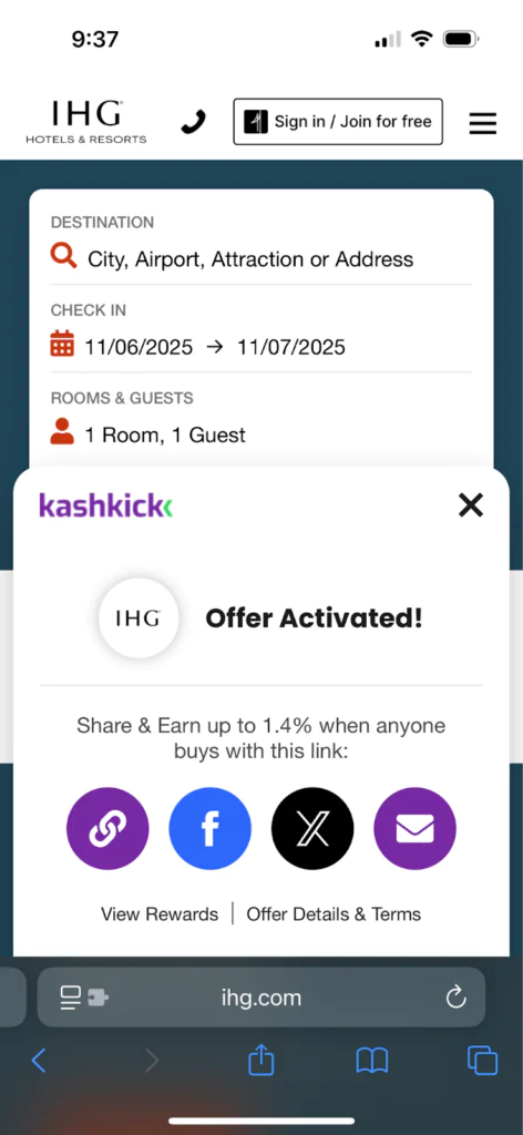 I eventually landed on an IHG property with a solid rate and a 1.4% KashBack offer. I already had the KashBack mobile Safari extension installed on my phone, so activating the offer was effortless. (Master tip: You’ll get a $2 bonus just for installing this extension!)