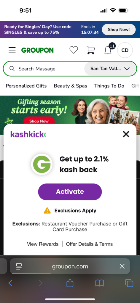 We had Saturday morning free before the game, so I hopped on Groupon—and was pleasantly surprised to see KashKick had a KashBack offer, too: up to 2.1% back.