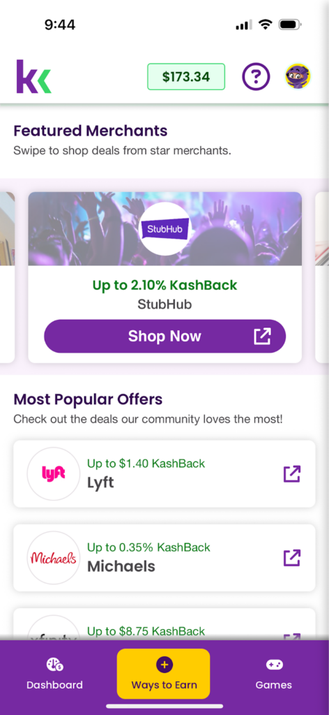 Ready to use my $200 to pay for the game tickets, I headed over to the “Shopping” section of KashKick and discovered I could score 2.1% KashBack from StubHub. It might not sound like a ton, but, hey, it’ll get us a hot dog at the game!