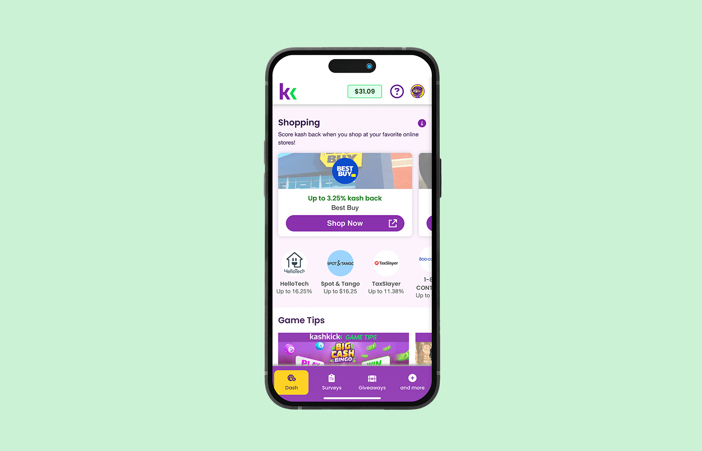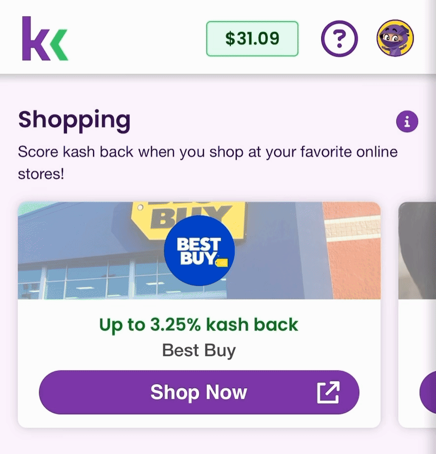 Head to the Shopping section on your KashKick Dash tab—that’s where your KashBack merchants live! - Swipe Through Merchants