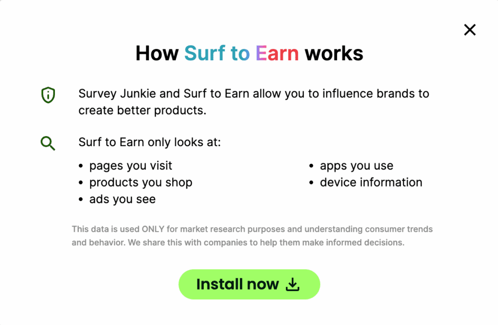 In addition to surveys, you can also make money through Survey Junkie’s Surf to Earn program. When you opt in to Surf to Earn (via desktop or mobile), you agree to share information about your online searches, site visits, app usage, shopping activity and ad views.